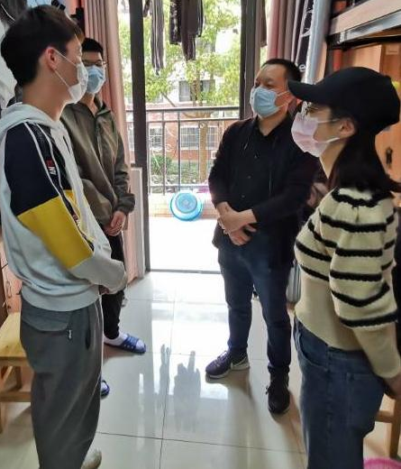 在交流了走访主要目的后,辅导员各自走访自己学生的宿舍,王健和分团委书记陆佳慧主要走访了毕业班宿舍,在走访过程中他们与同学们进行了亲切交流,详细了解学生的就业、毕业设计、线上学习及校园封闭管理后的生活感受,询问他们是否存在困难和问题,叮嘱同学们要严格遵守疫情防控期间校园管理要求,共同营造安全有序的校园环境。