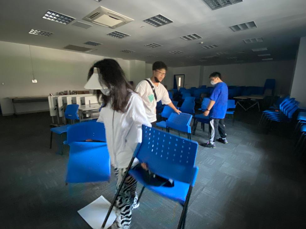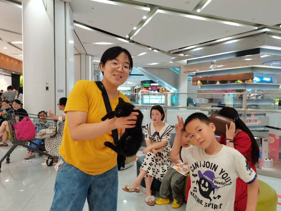 活动前,团队成员6人在商场经理的带领下,搬置了大量的桌椅到商场指定区域布置现场。完成后与江海流浪动物救助基地负责人取得联系,等待基地人员将小动物搬至现场。基地工作人员到达现场后,团队成员一起布置笼子、安放小动物、投喂小动物。