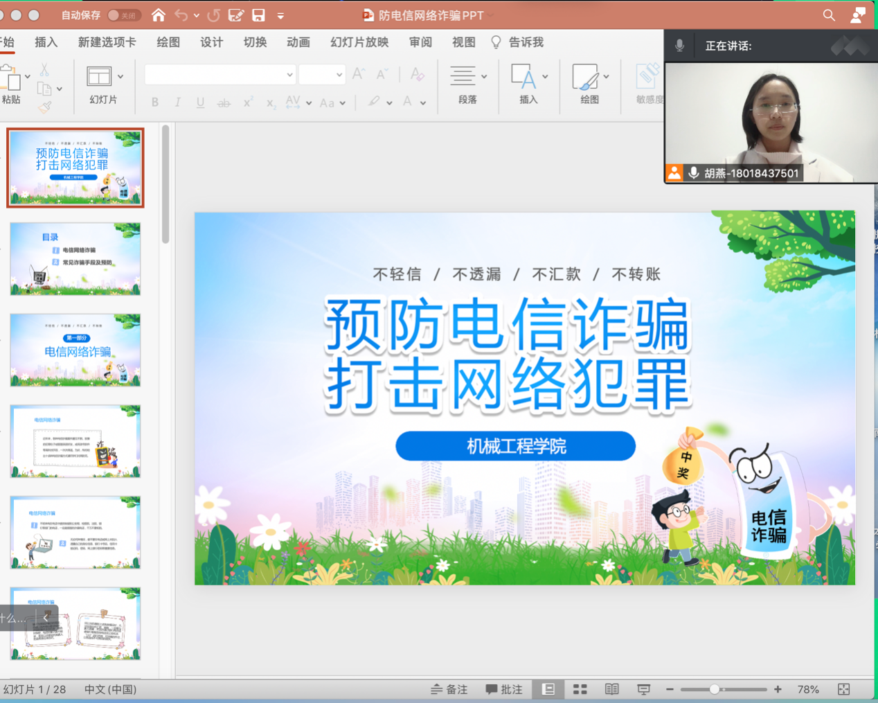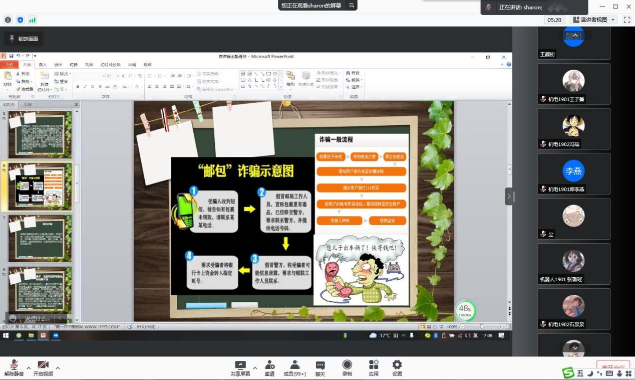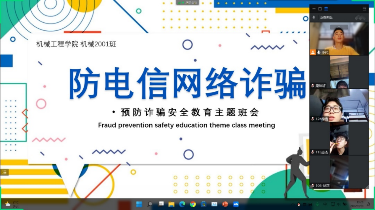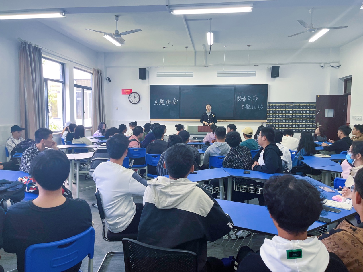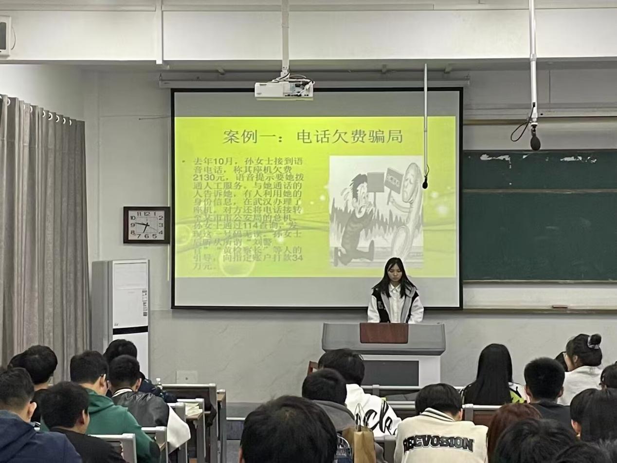 各年级辅导员从具体案例出发,有针对性地向同学们介绍了电信诈骗的常见手段与一般流程,并让同学们就诈骗案件发生的主观、客观原因进行了探讨与交流,提出一些可行有效的防诈骗方法,最后通过一系列知识问答使同学们对防诈骗知识进行了进一步的巩固。此外,在班级群里也发布防范网络诈骗短视频及公众号链接,提高同学们的防范意识。