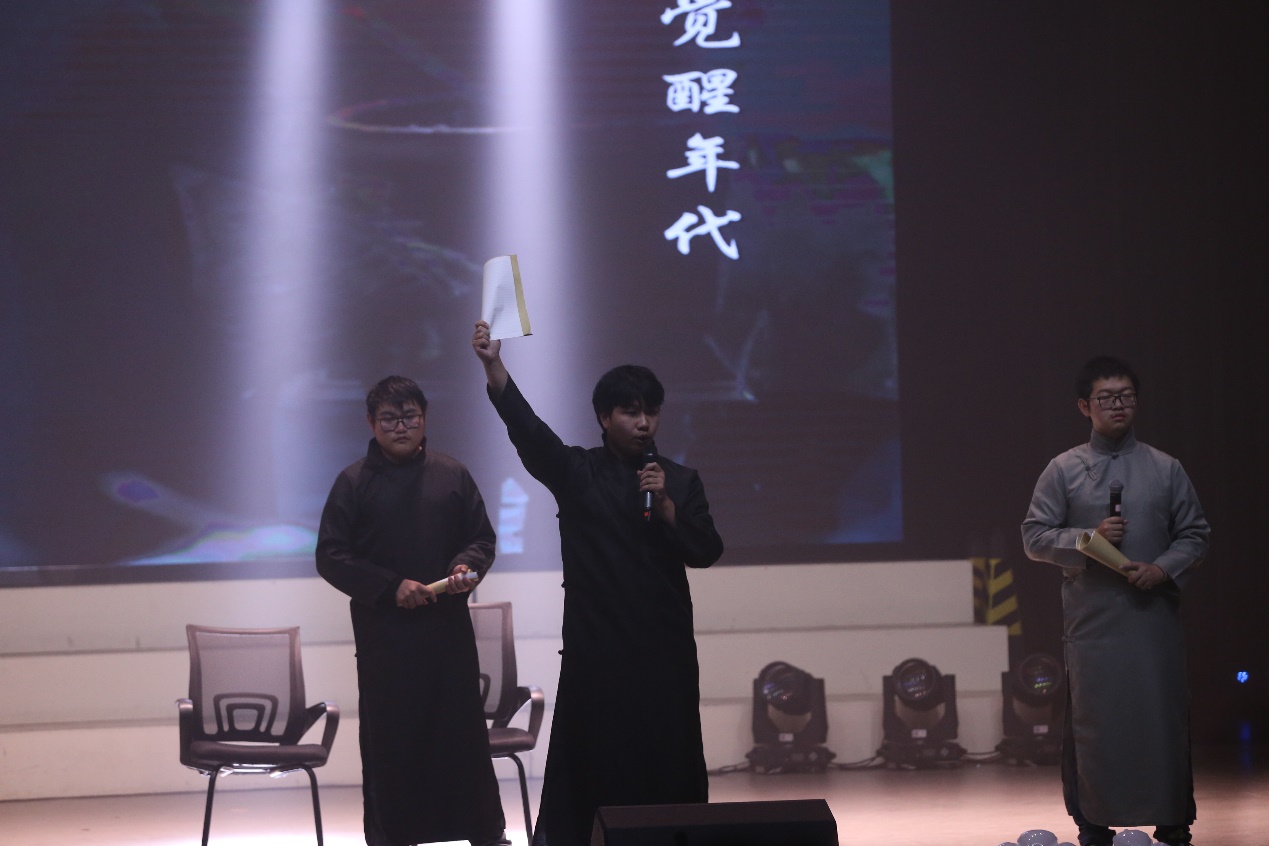 材料2201班表演的幕布剧《觉醒年代》艺术地再现了一百年前中国的先进分子和一群热血青年演绎出的一段追求真理的澎湃岁月。