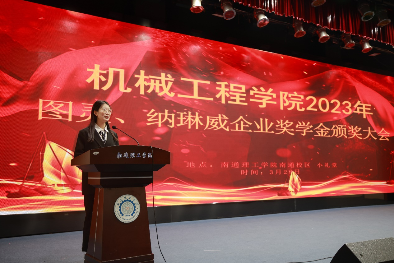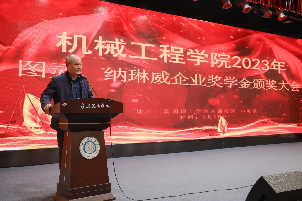 3月28日上午,8858cc永利官网在南通校区小礼堂举行2023年图灵、纳琳威企业奖学金颁奖大会,参加本次活动的有纳琳威纳米科技(上海)有限公司南通分公司总经理胡海涛、副校长赵怀斋,招生与就业处处长张颖、机械工程学院院长姜银方、副院长孙健华、机制教研室主任徐媛媛、学院团委书记陆佳慧、就业指导办公室主任邱帅及辅导员师生代表。副书记兼副院长王健主持本次会议。